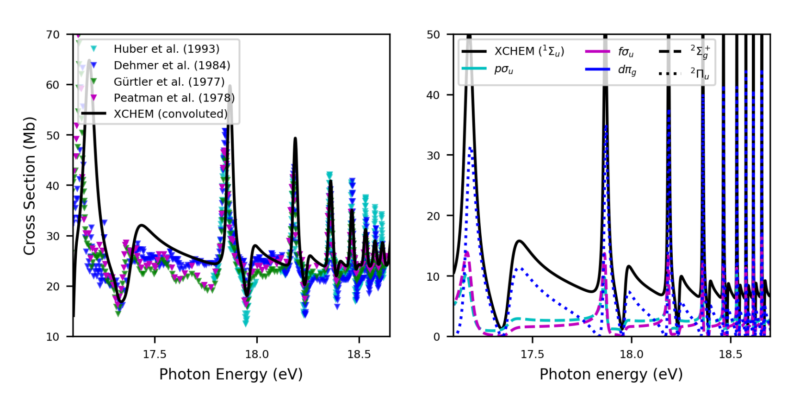 Figure 1: Photoionization cross section of N2 obtained with XCHEM. Left: total cross section compared to experiment (J .Phys. Chem. Lett. 2018, 9, 756-762). Right: Partial cross sections for different symmetries of the molecule before and after ionization and the ejected electron (Phys. Rev. A 98, 033413).