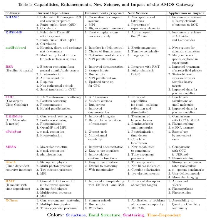 The idea for the AMOS Gateway was initiated at a workshop at the Institute for Theoretical Atomic and Molecular Physics (ITAMP) held at the Harvard-Smithsonian and organized by Schneider, in May of 2018. The focus of the workshop was to examine the requirements and to then suggest a process for developing robust and flexible software in AMOS. A subset of the attendees felt the time was ripe to bring together the AMOS community to work collectively to make their codes available and easier to use by the partners and eventually the AMOS community at large. By necessity, a project such as this requires the developers to work on issues of portability, documentation, ease of input, as well as making sure the codes can run on a variety of architectures. Doing this via the Science Gateways arm of the NSF XSEDE project seemed a natural avenue. We applied to the program for a startup award, which was granted, and began our efforts in earnest in July of 2018.
